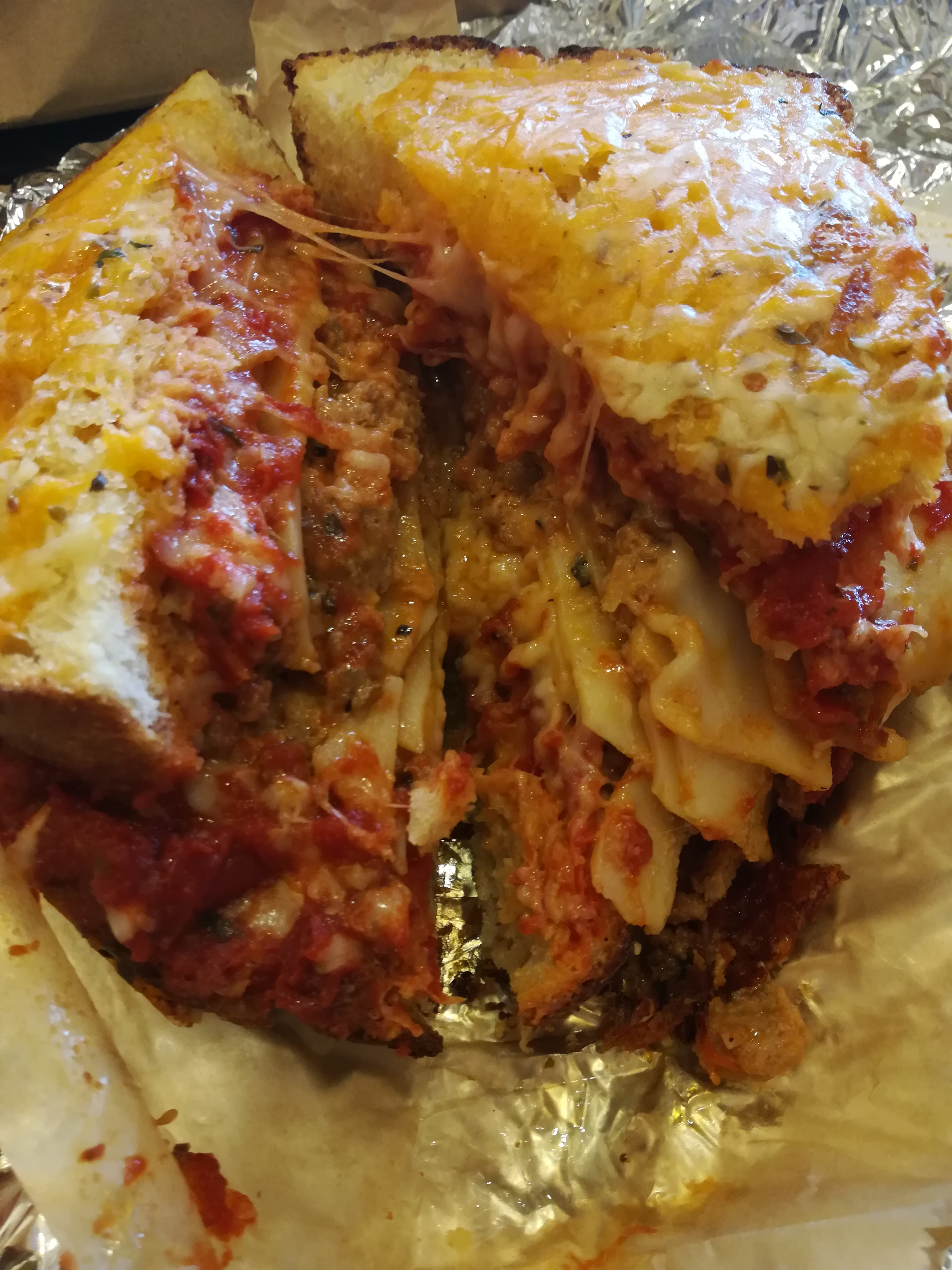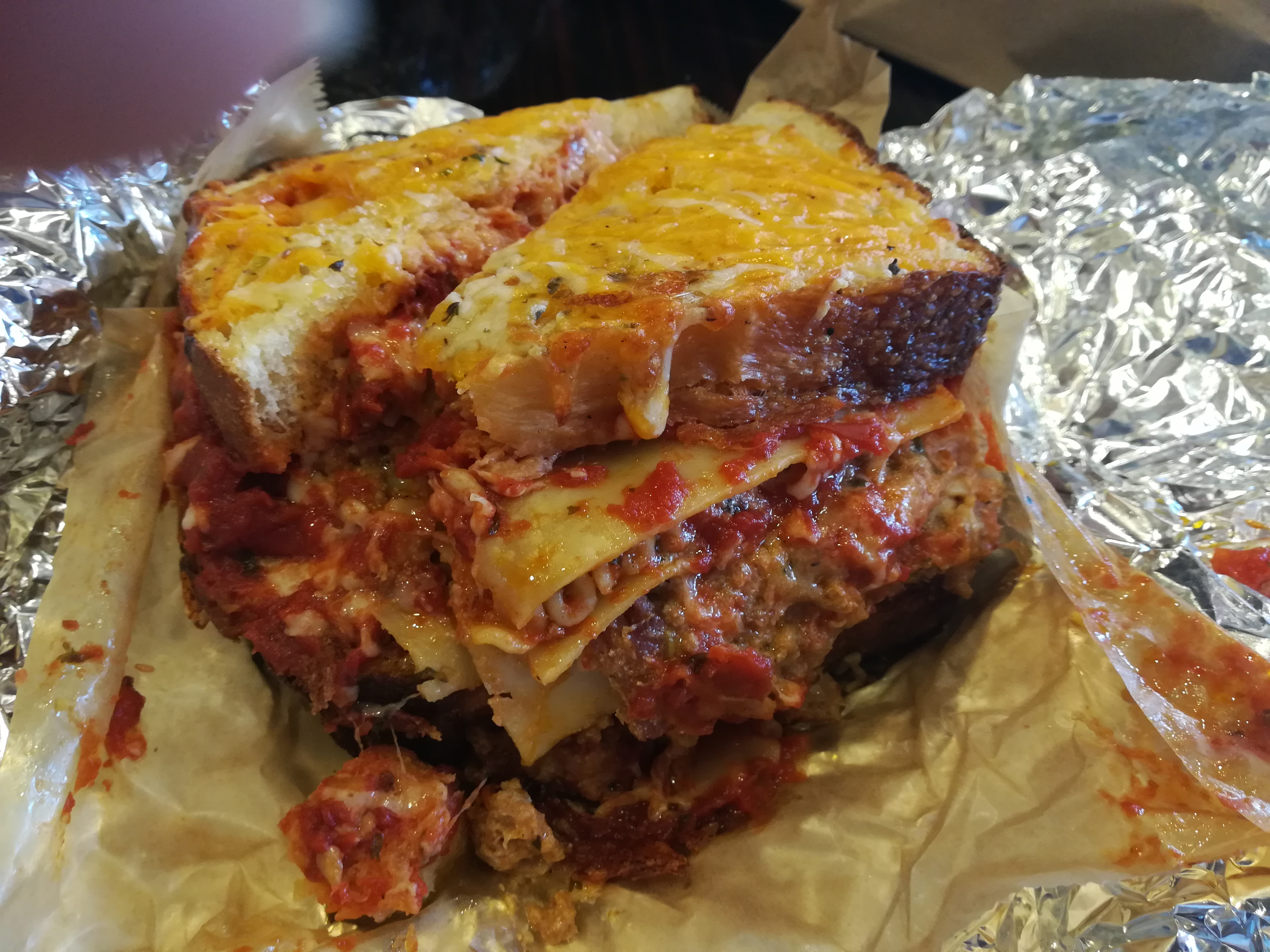 Let’s go to Rosemead, California. If you can’t believe your eyes, I’m telling you that this is the real deal. I wonder who came up with this crazy idea to pair a grilled cheese with a lasagna? Whoever was the genius behind this creation deserves a Michelin star or the Nobel peace. If you’re ever in Southern California, then you need to stop by Rose City Pizza to try this wonder of the world. You should arrive early, because the lines are always out the door. Lets break down this sandwich… In between two grilled cheese sandwiches comes a hefty portion of lasagna. The pairing is crazy, but it somehow works. You will need to wait about 15 minutes for this to be concocted, and it’s not cheap. Take your own shot at it, and let me know.